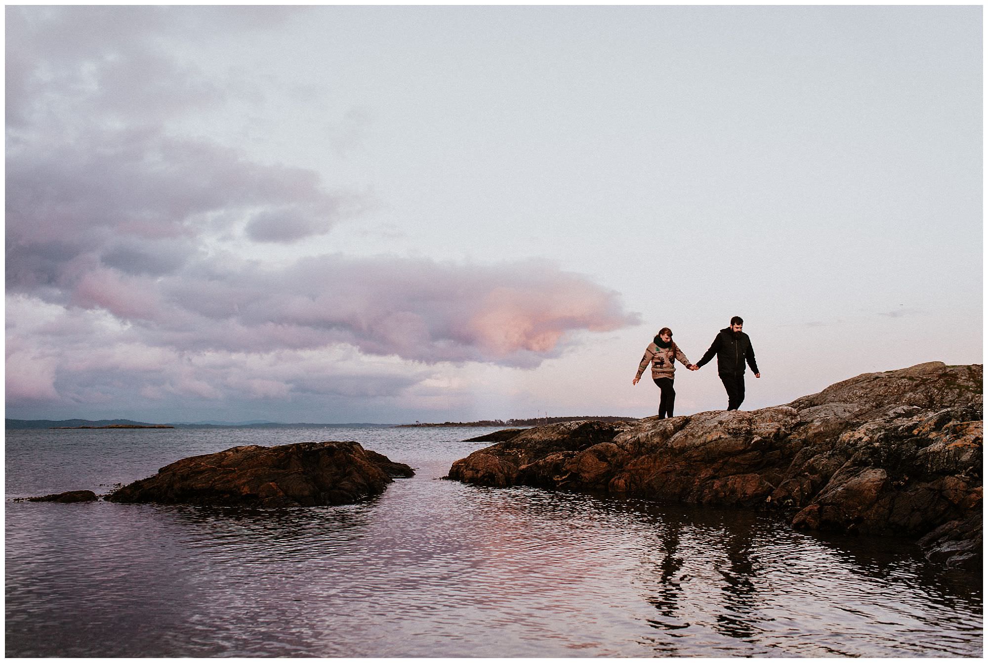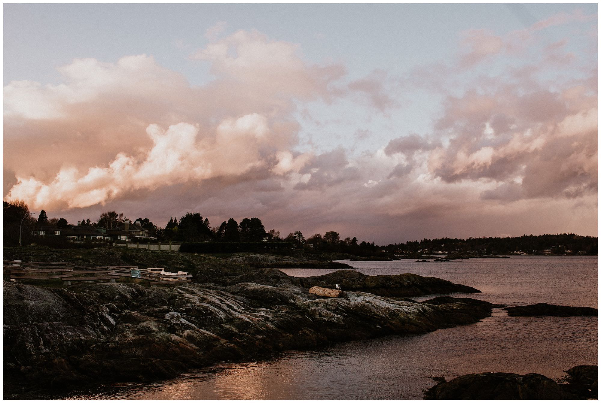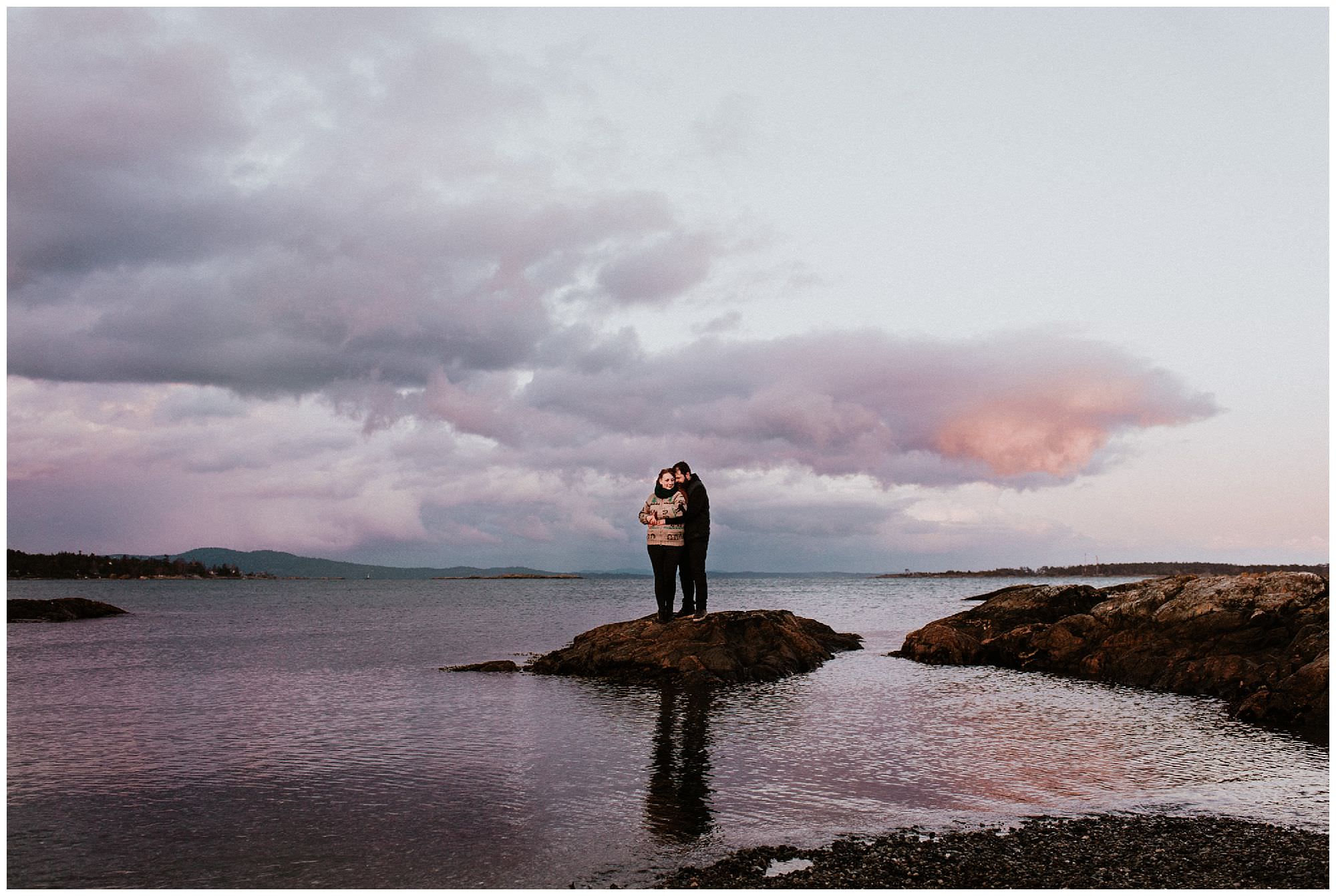 After finding all of the best light and three curious peacocks we took a 30 minute drive over to Cattle Point to catch a beautiful purple sunset. We braved jagged rocks, aggressive winds and a storm that threatened to unleash at any second and were rewarded with a stunning sunset for the end of their engagement session.