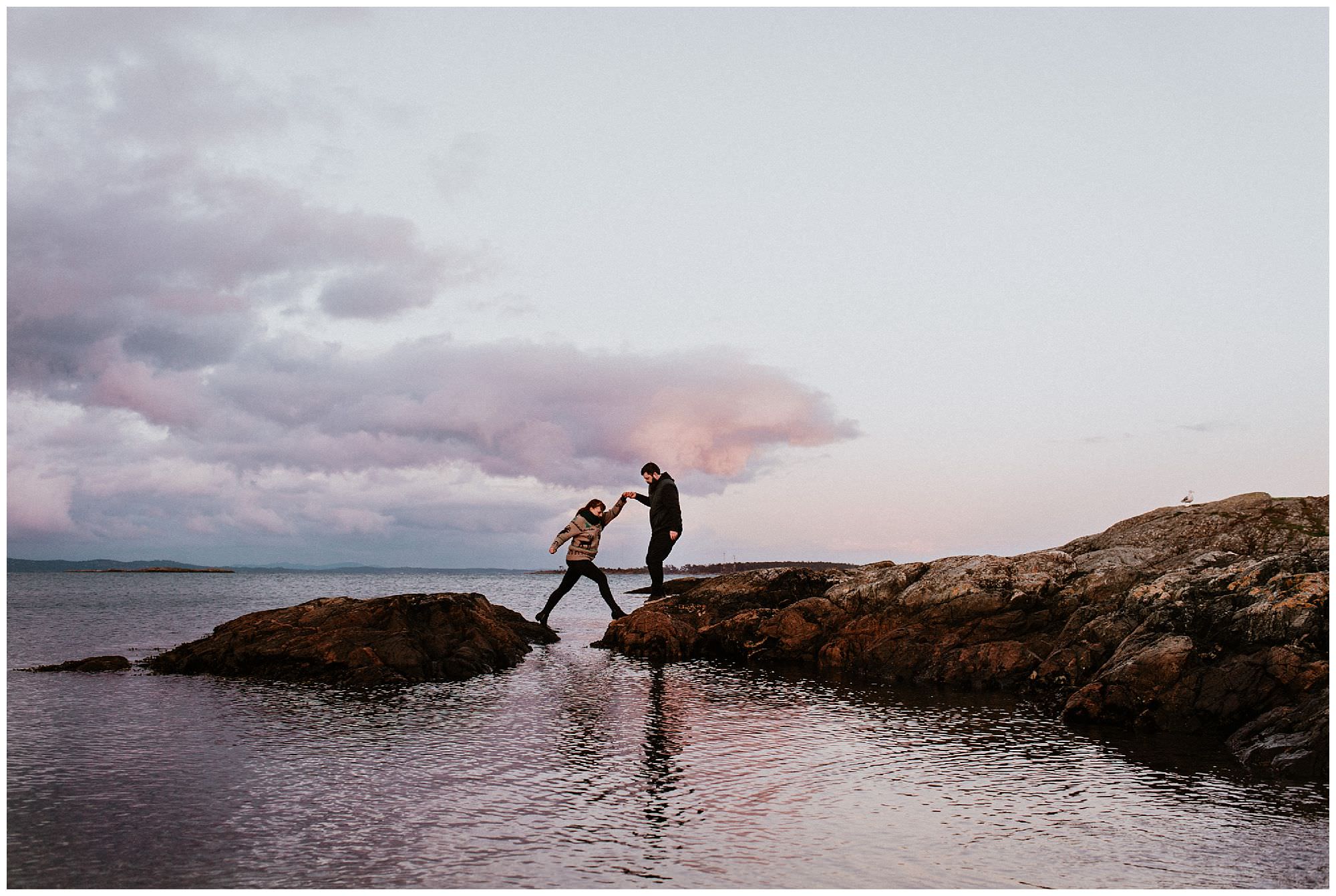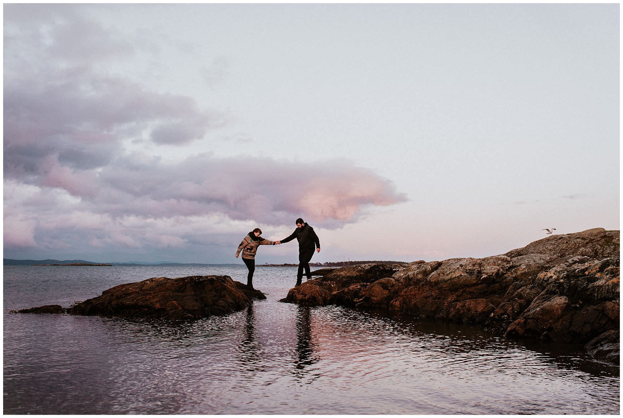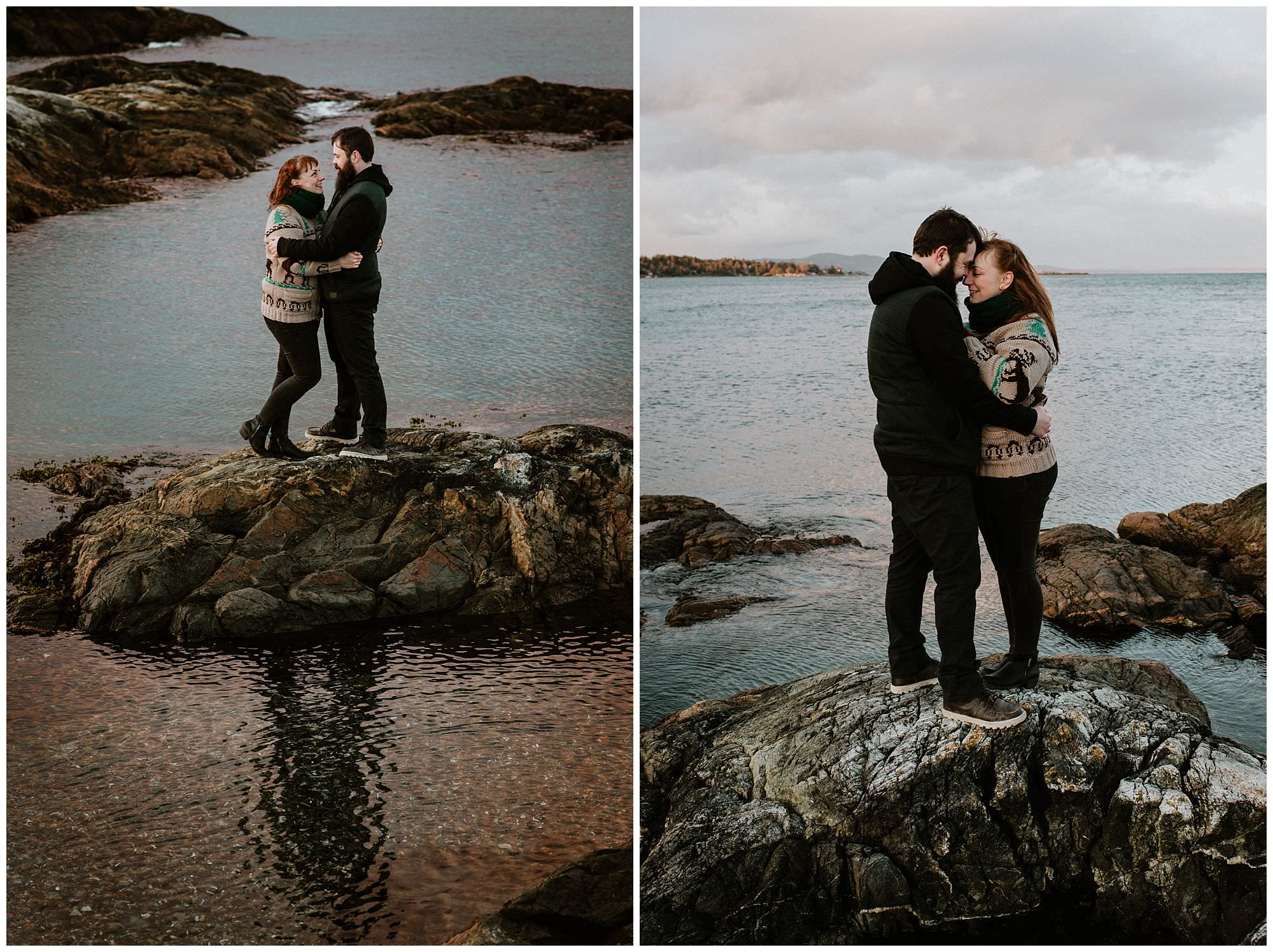 After finding all of the best light and three curious peacocks we took a 30 minute drive over to Cattle Point to catch a beautiful purple sunset. We braved jagged rocks, aggressive winds and a storm that threatened to unleash at any second and were rewarded with a stunning sunset for the end of their engagement session.