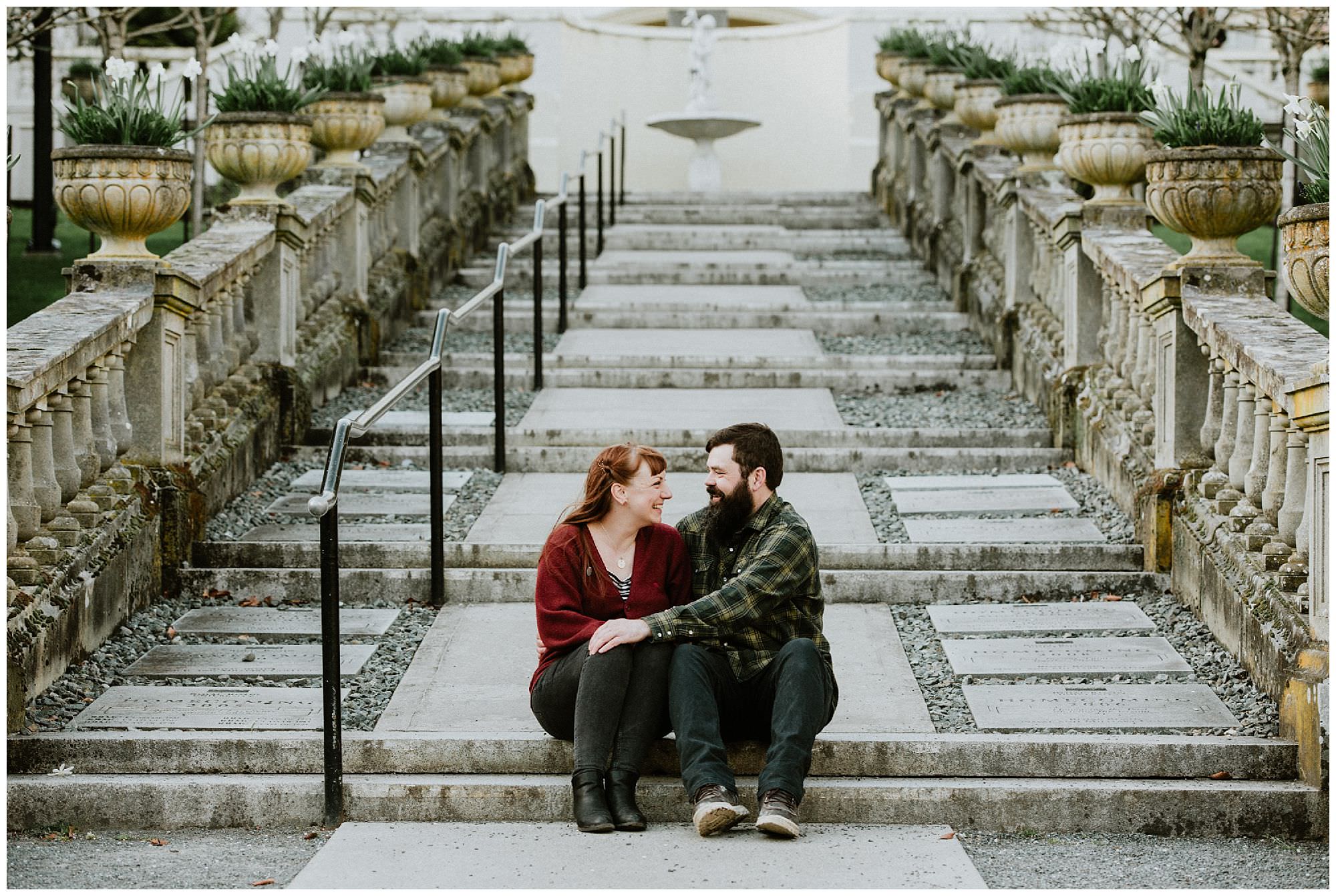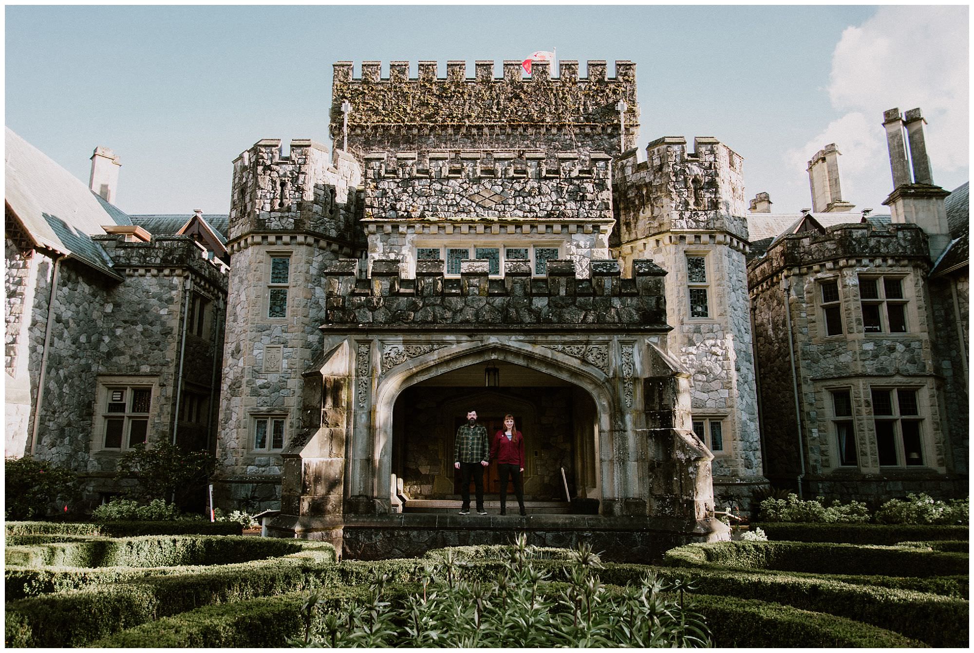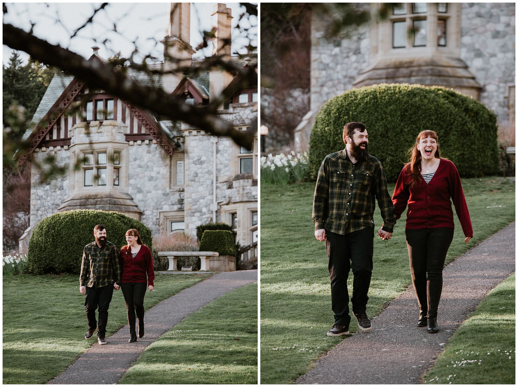 Andy and Mae live on Vancouver Island near Sooke, BC. If you’ve been up that way you know that there are some awesome breweries, gorgeous seaside landscapes and when the weather is just right you can get some of the prettiest sunsets in BC. When we started talking about where they might want to start with photos Mae instantly knew that she wanted to start our engagement session at Royal Roads University where Andy first asked Mae to go steady (yes, he used those exact words, and yes my heart melted).