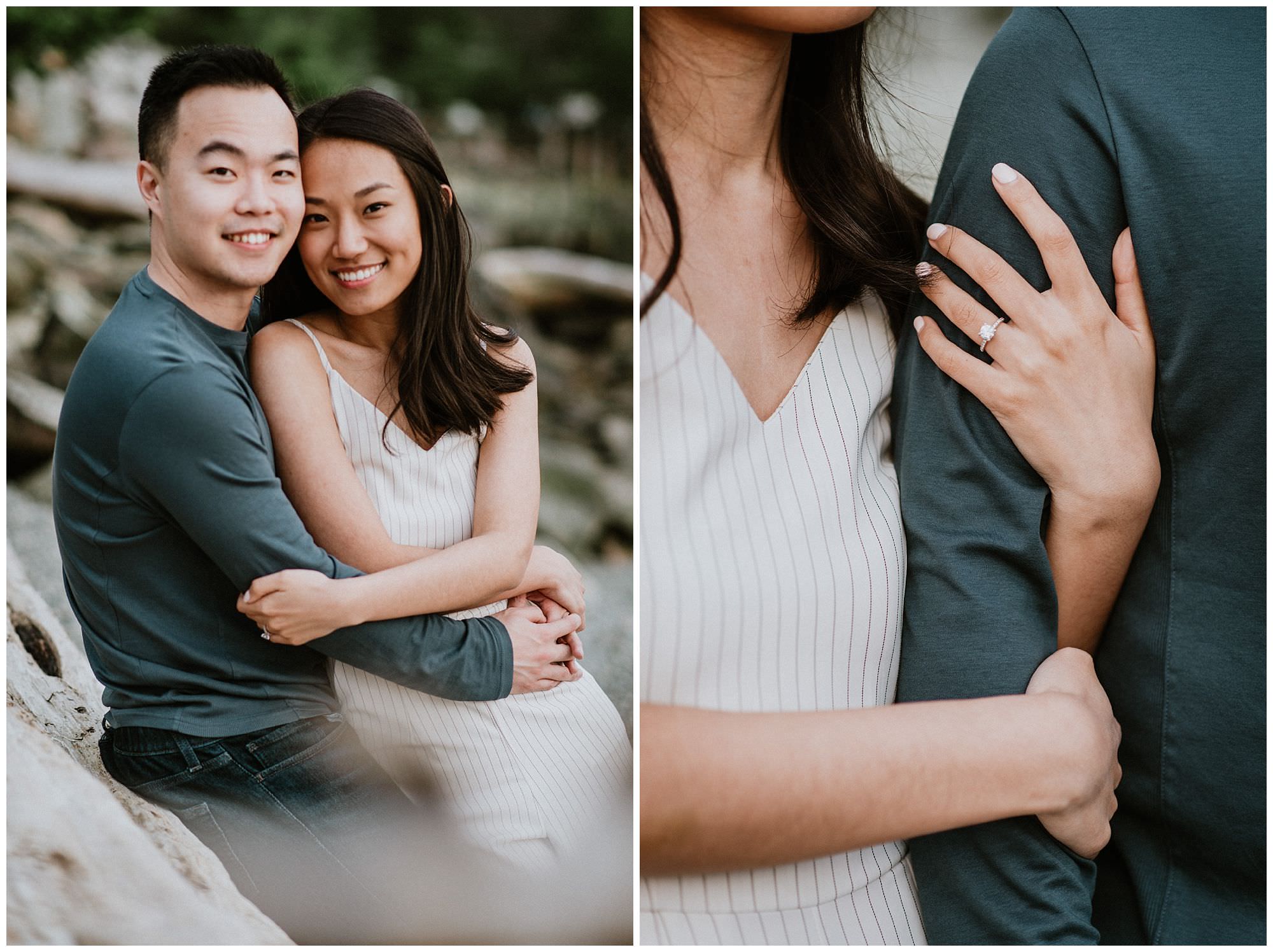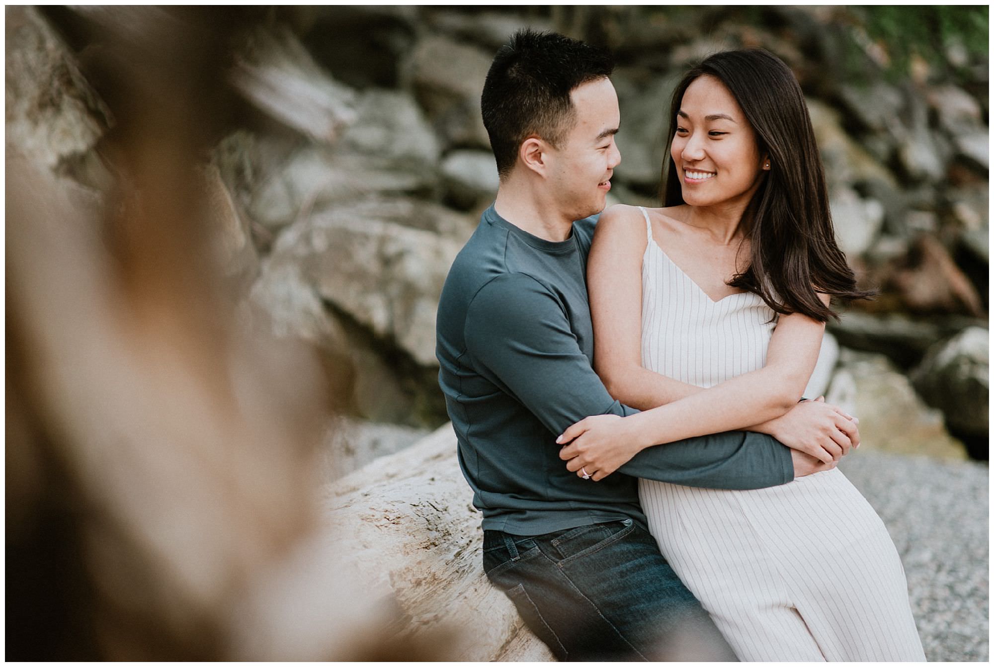 The weather had kind of tortured us all week and we had to keep re-scheduling, but since they were so tight on time we ended up just having to commit to a day and hoping for the best. Well, Mother Nature was on our side because we got a beautiful blue sky, warm weather and almost no tourists in sight. All in all, it was a perfect sunny day for engagement photos on top of a mountain, with enough daylight (and warmth) left over than we got to pop down to Britannia Beach to finish off their engagement session. (PS, it turns out that “Britannia Beach” is not actually much of a beach, and more of a tiny sandbar)